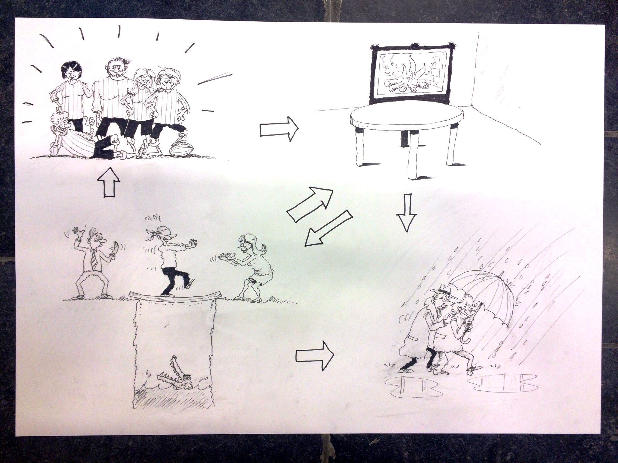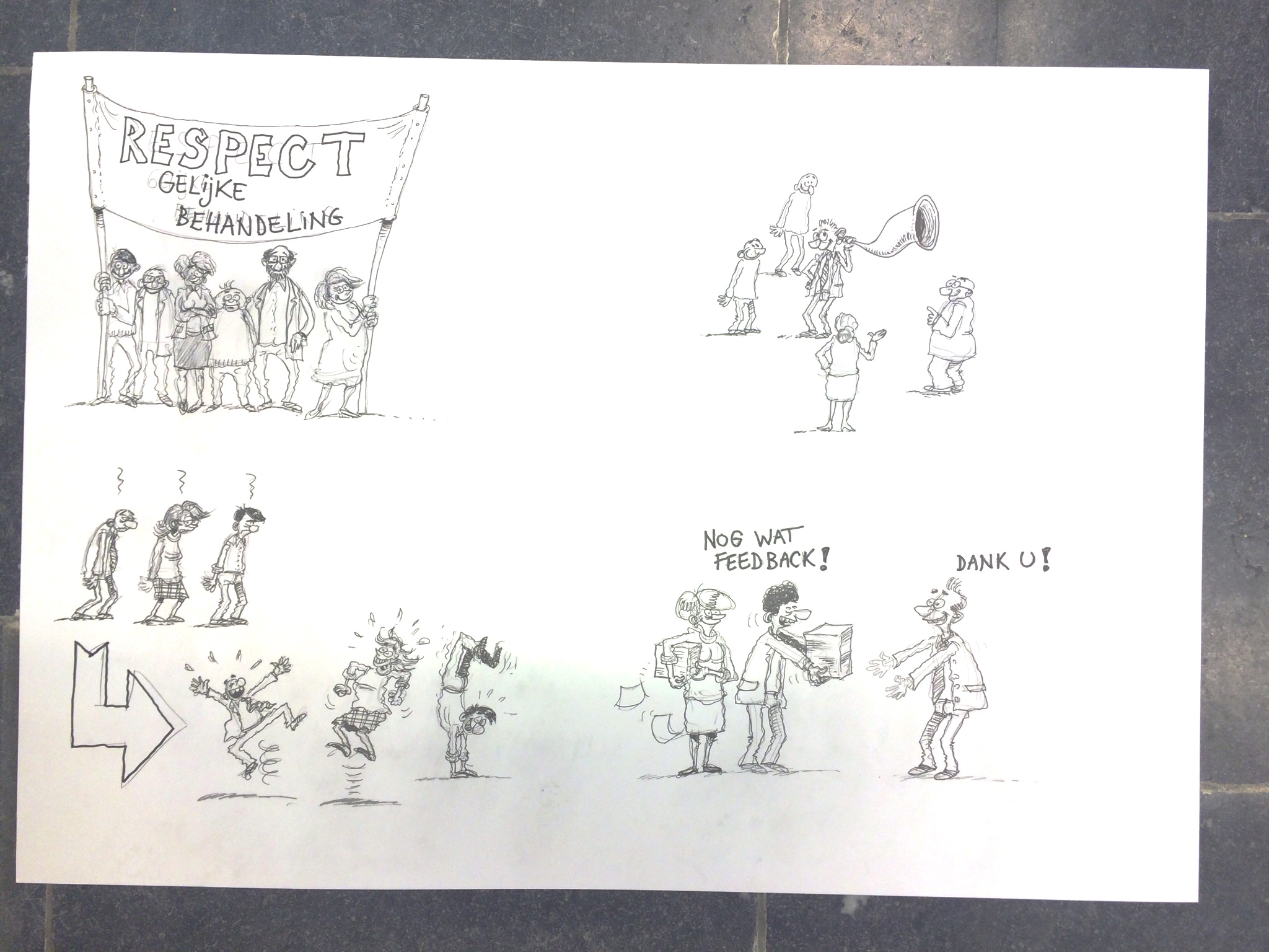 Een brainstorm samen met een groepje regiomanagers van KBC, over hun ideale werkklimaat. Dan teken ik de flappen, en met die flappen leggen ze hun droombeelden uit aan hun collega’s.